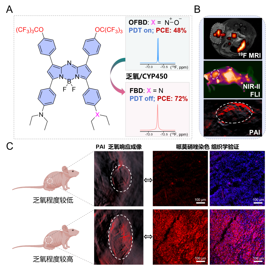 (A) OFBD和还原态FBD的分子结构与氟谱;(B) OFBD纳米乳在小鼠体内的19F MRI/NIR-II FLI/PAI多模态成像;(C) PAI 与哌莫硝唑染色反映肿瘤乏氧程度
