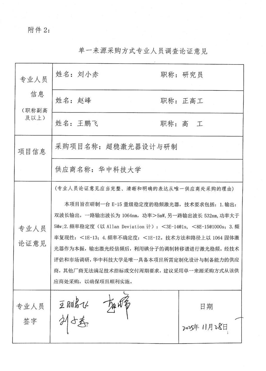本项目旨在研制一台E-15量级稳定度的稳频激光器,技术要求包括:1.输出:双波长输出,一路输出波长为1064nm,功率>5mW,另一路输出波长532nm,功率大于 5Mw;2.频率稳定度(以Allan Deviation 计):<3E-14@1s,<8E-15@1000s;3.频率复现性:<1E-13;4.频率不确定度:<1E-12。技术方法和路径上以1064固体激光器作为本振,输出激光经倍频后,利用碘分子的调制转移谱进行激光稳频。经技术评估和市场调研,华中科技大学是唯一具备本项目所需定制化设计与制备能力的供应商,其他厂商无法满足技术指标或交付周期要求,建议采用单一来源采购方式从该供应商处采购,以确保项目顺利实施。